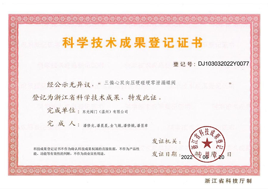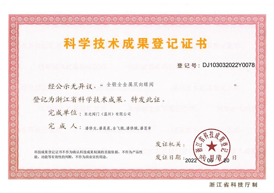 全鍛全金屬雙向蝶閥 科學(xué)技術(shù)成果